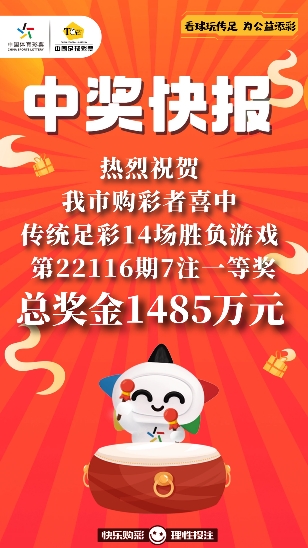中国体育彩票传统足彩14场胜负游戏第22116期开奖,我市购彩者发挥神勇斩获7注头奖,总奖金高达1485万元。值得一提的是,在收获这7注头奖后,我市今年中出的足彩百万级大奖数量已经达到了39个。