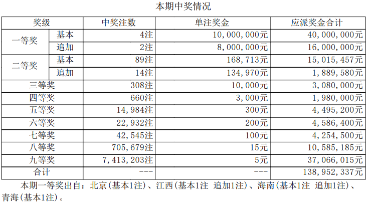 本期全国共开出4注一等奖,其中,2注为1800万元(含800万元追加奖金)追加投注一等奖,出自江西南昌和海南海口;2注为1000万元基本投注一等奖分落:北京丰台和青海城中区。