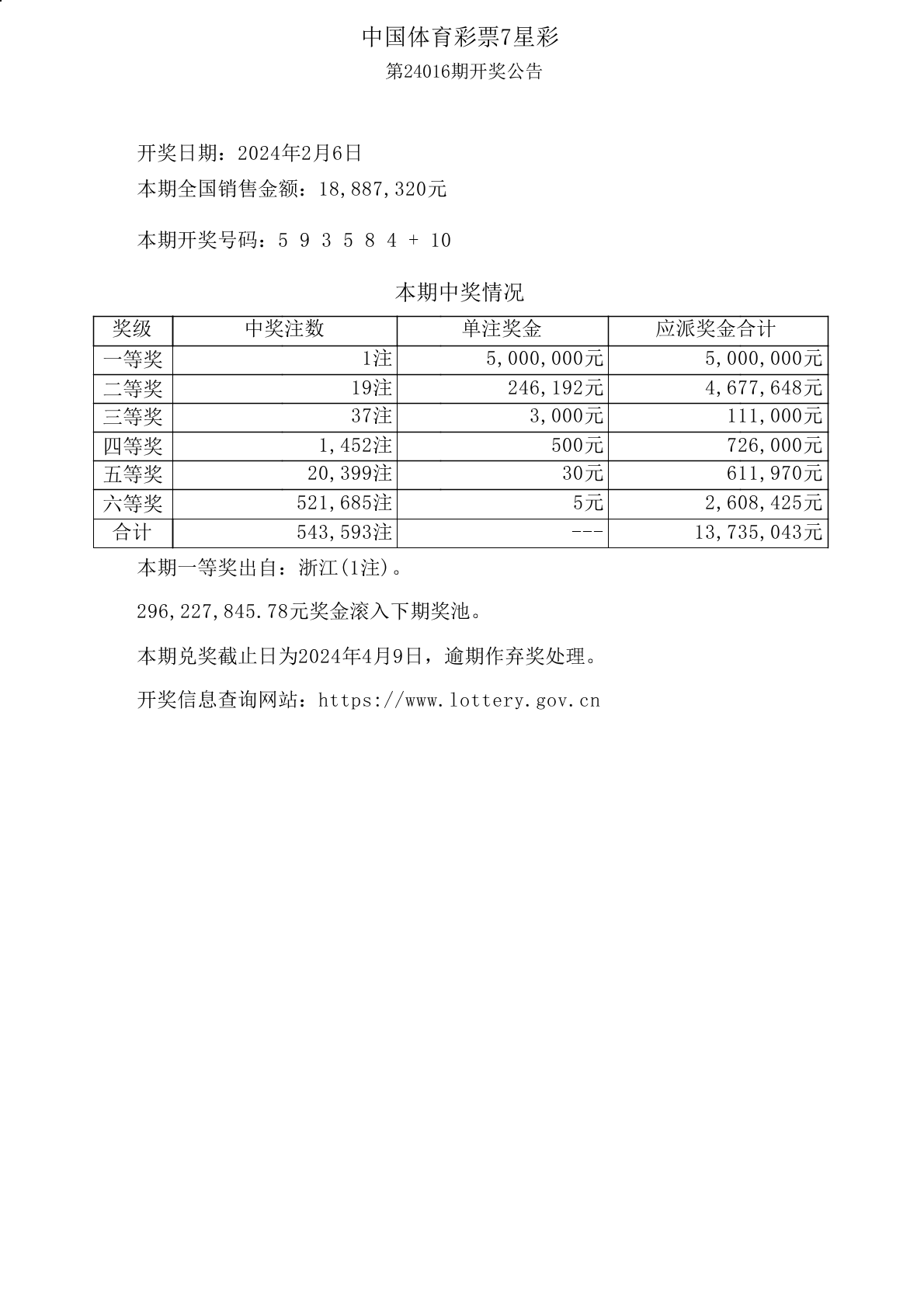 中国体育彩票7星彩第24016期开奖公告