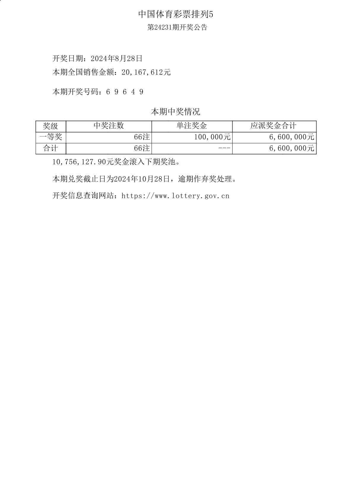 中国体育彩票排列5第24231期开奖公告