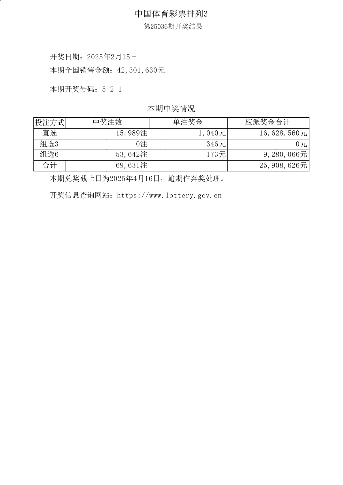 中国体育彩票排列三第25036期开奖公告