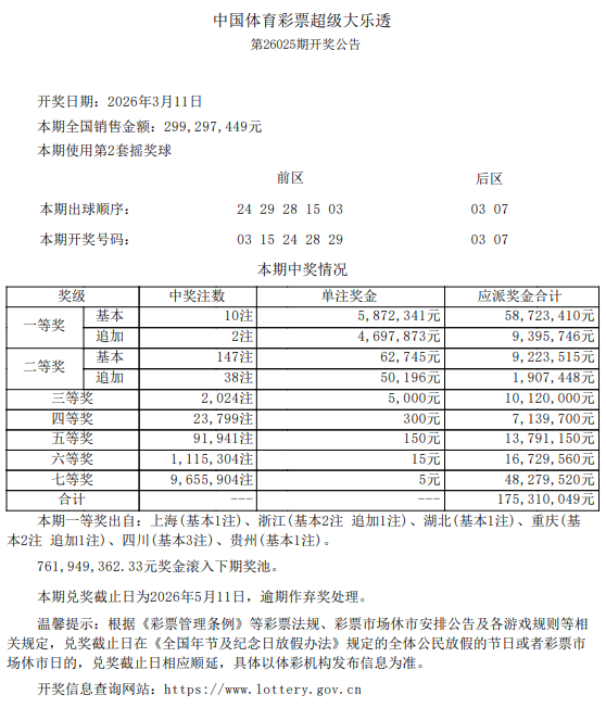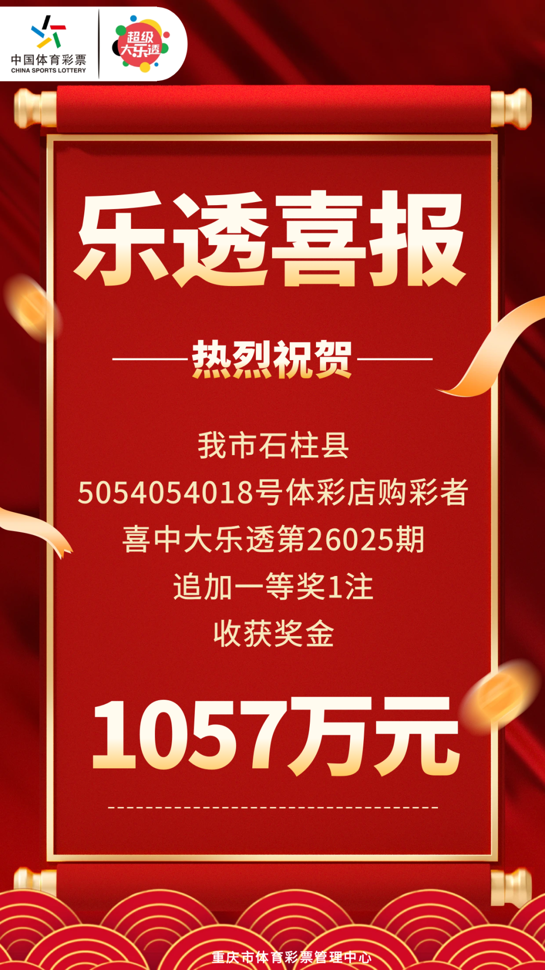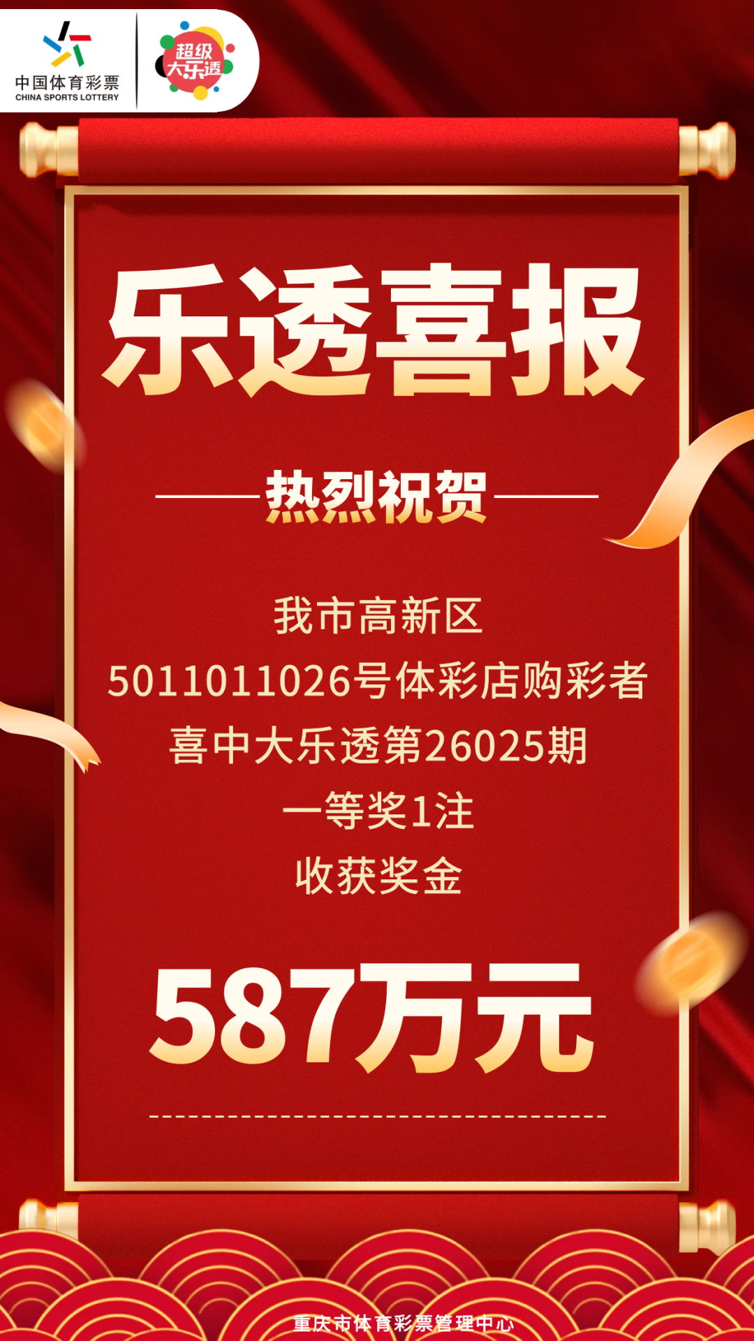 快报 ‖ 重庆购彩者喜中第26025期大乐透一等奖2注